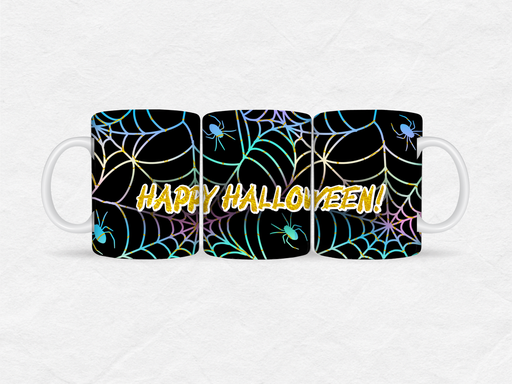 Célébrez Halloween avec style grâce à ce mug décoré de toiles d’araignée multicolores et de l’inscription Happy Halloween en lettres dorées 🕸️✨